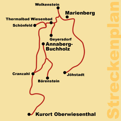 Wolkenstein, Thermalbad Wiesenbad, Plattenthal, Schönfeld-Wiesa, Annaberg-Buchholz uBf, Annaberg-Buchholz-Süd, Cranzahl, Königswalde, Bärenstein, Annaberg-Buchholz oBf, Streckewalde, Großrückerswalde, Niederschmiedeberg, Oberschmiedeberg, Steinbach, Schmalzgrube, Schlössel, Jöhstadt, Papierfabrik Schönfeld, Unterneudorf, Neudorf, Vierenstraße, Kretscham-Rothensehma, Niederschlag, Hammerunterwiesenthal, Unterwiesenthal, Oberwiesenthal